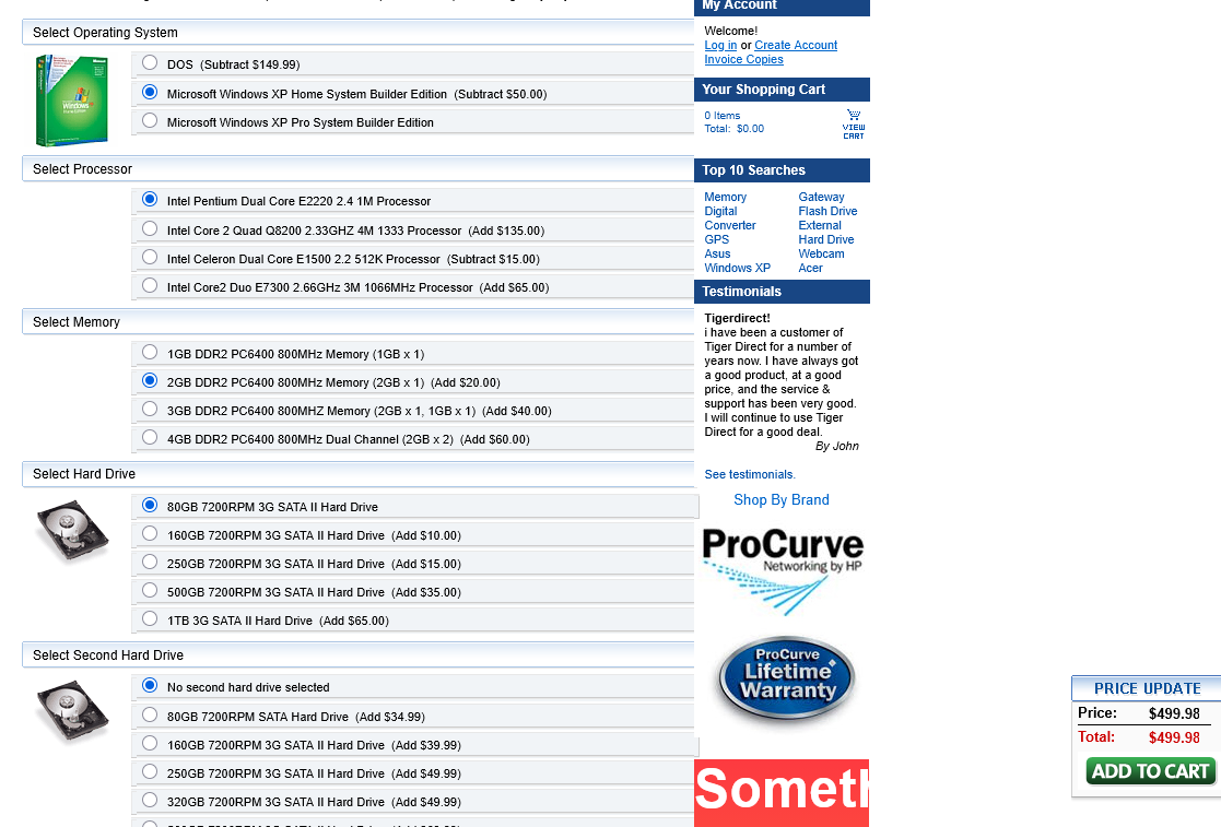 I spent so. much. time. on this screen, trying to pick something that I liked but wasn’t too expensive. You’ll note on the earlier spec sheet picture that it says “Free DOS,” that’s because I picked DOS as my OS because Windows was too expensive, and I wanted the GPU. Amazing. DOS! Still existed in 2009. I’m honestly super pleased that I found this. Thanks Wayback Machine!