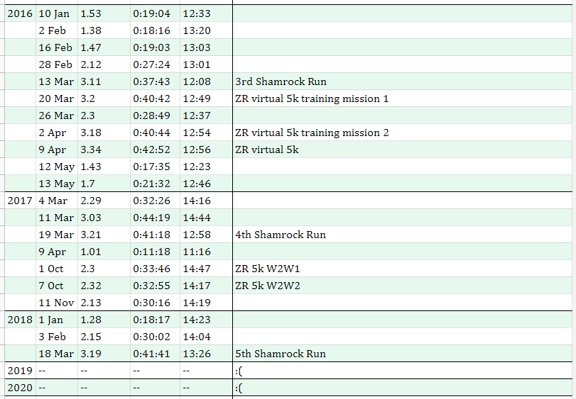 The good news is that I was still getting steps in. Frequently at work on my lunch breaks I would go for a walk, and then the walks to the train and to home were helpful too. At this point, my exercise data is limited to Google Fit, which kept track of my steps. Runkeeper was out in 2015, and Zombies Run was largely abandoned with the 5th Shamrock Run.