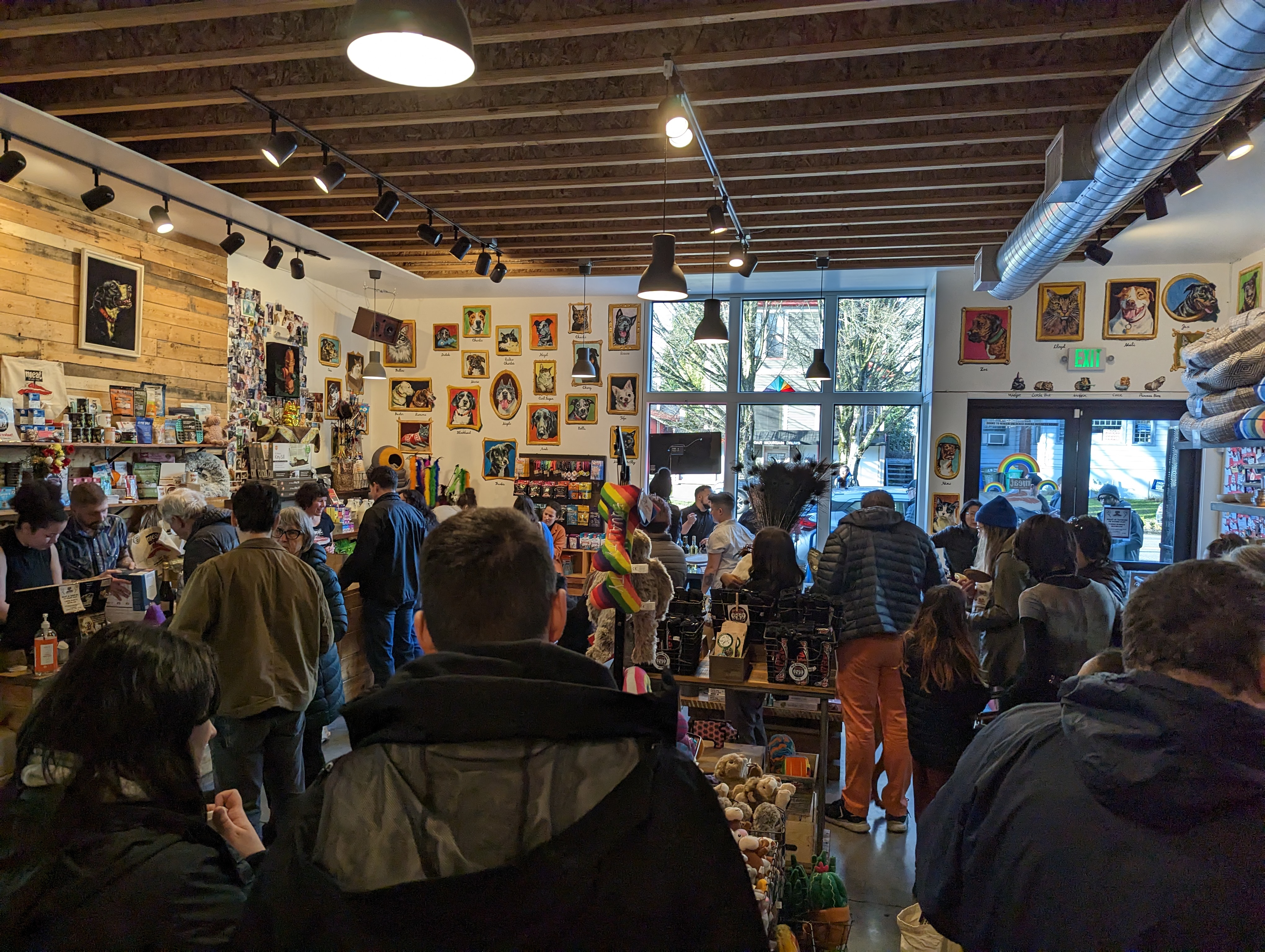 Like, more people than I’ve ever seen in the store. So many people that I actually had a bit of an anxiety attack and had to leave. Well, it was that plus I discovered while I was in the store that I basically had no money, or less money than I thought I had at least, and couldn’t buy anything. That + loads of people + pervasive smell of dog breath was enough for me to grab one of the free treat goody bags and then head out. I did end up stopping by a couple of days later and got to chat with Heidi, the owner, which was great. She’s a good egg and I’m glad her shop exists!
