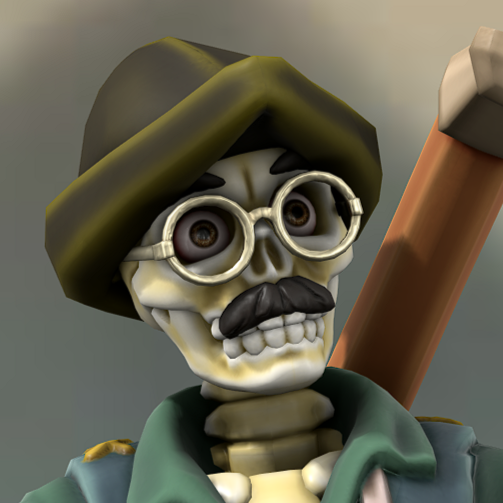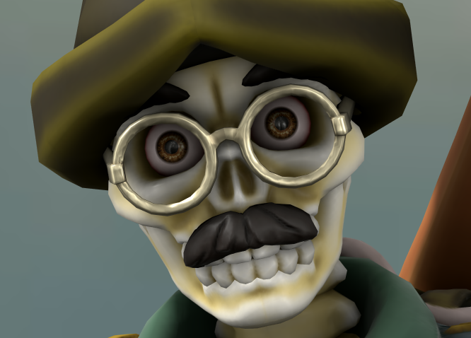Skelly has glued a mustache and eyebrows to his skull and inserted two glass eyes into his eye sockets.