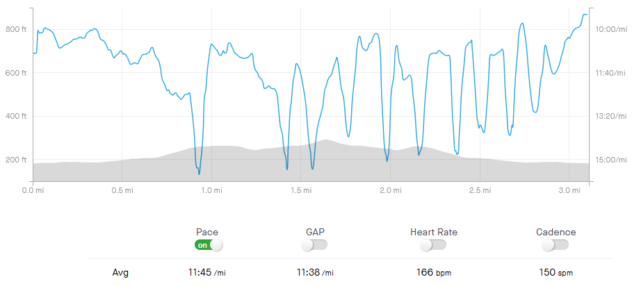 The craziest part is that I was going to set up a PacePro plan on my Forerunner for an 11:30/mi pace, but decided against it at the last minute because I didn’t want my damn watch to beep every five seconds telling me I’m too fast or too slow. So instead I just ran and was only 15 seconds off.