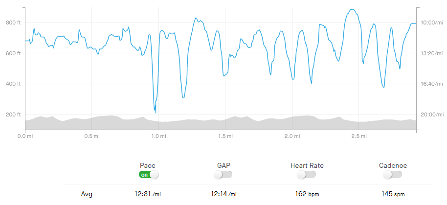 I managed to eke out 11 minutes of straight running, including uphill, before I fell into my normal run/walk pattern. At one point I had to tie both of my shoes, costing me precious time. Also a lady I was running close to got confused about the turnaround point so a couple of us kind of slowed down to help her/get confused ourselves.
