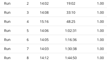 Those numbers by Run are laps, not mile markers. 1st lap was the 5min warmup.