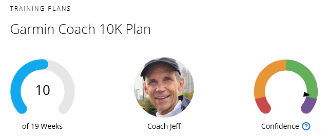 Garmin Coach has a “Confidence” rating based on your progress and mine is creeping dangerously into “lets bump up your goal time” territory.