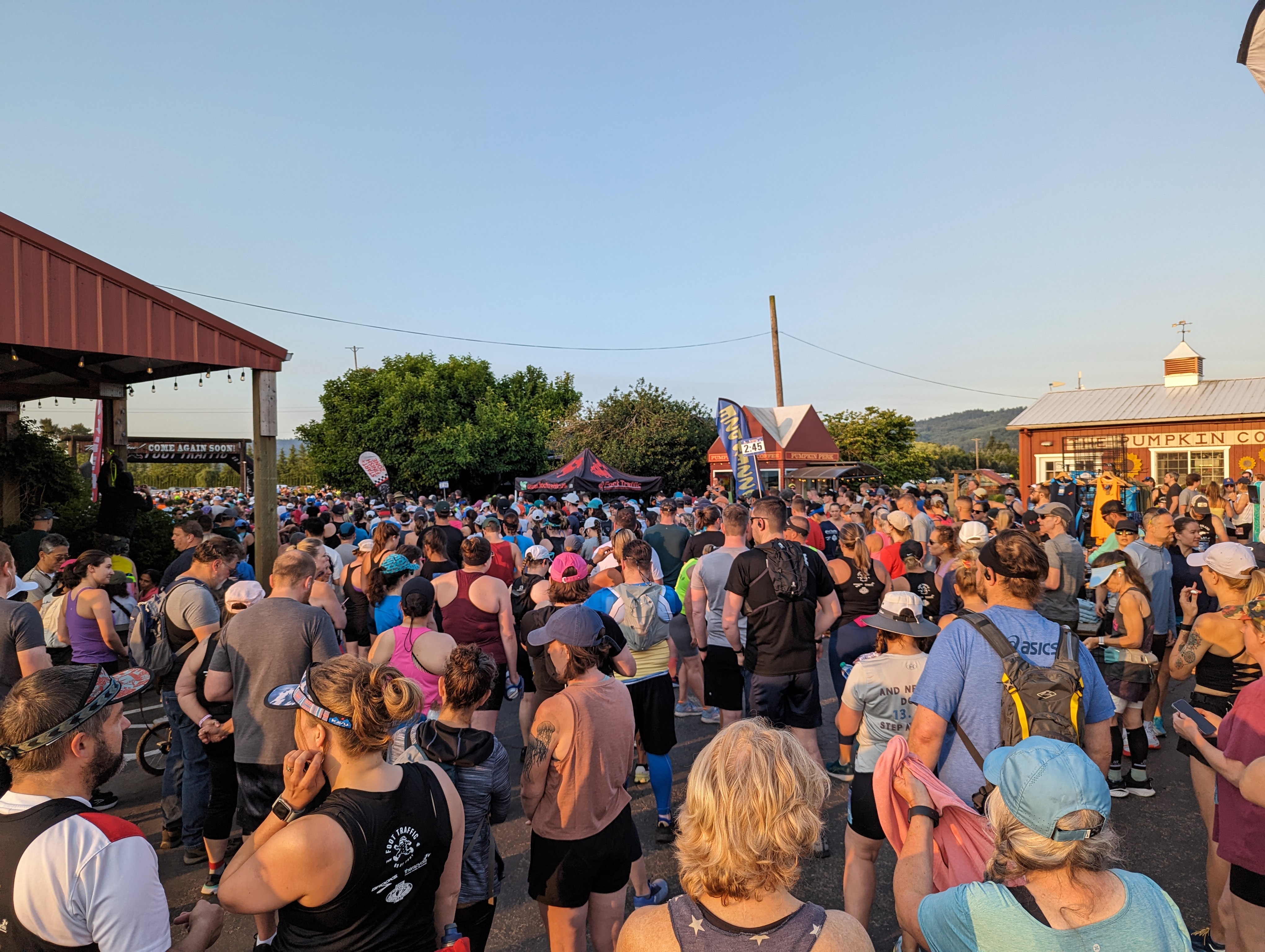 We get to the Pumpkin Patch, where the event starts, around 6:10ish. The race itself (my wave at least) starts at 6:38. My goal was this: to take my patented Pre-Race Poop (PRP) and then to do a quick warmup run. What actually happened was this: stand in line for the toilets for TWENTY GODDAMN MINUTES. The lines were so long. I can’t stress this enough. But I wait, because I know my bowel history. I get to a toilet at around 6:35, push like I’m having a baby1, and then get out and into the crowd, doing some jogging in place and nonsense like that because I didn’t have time for a proper warmup.