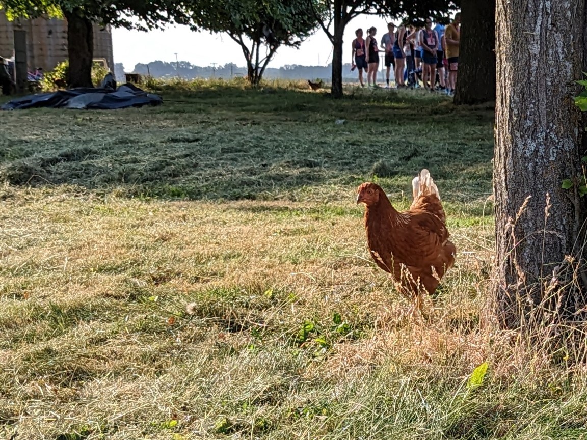All the other routes looped back to the start except ours; we had to wait in a farmer’s front yard until the shuttle arrived to pick us up. Us few, the privileged quarter marathoners. But while I was there, I saw a chicken.